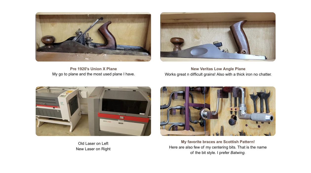 I Love old tools. The feel of a 100+ year hand plane or brace excites me and I love to use. But I also love the convenience, and accuracy of new powered tools. So as I as I have grown as a woodworker I live in both worlds. It is rare for any project to not have a hand plane grace its surface or be measured with a square that predates WWII.