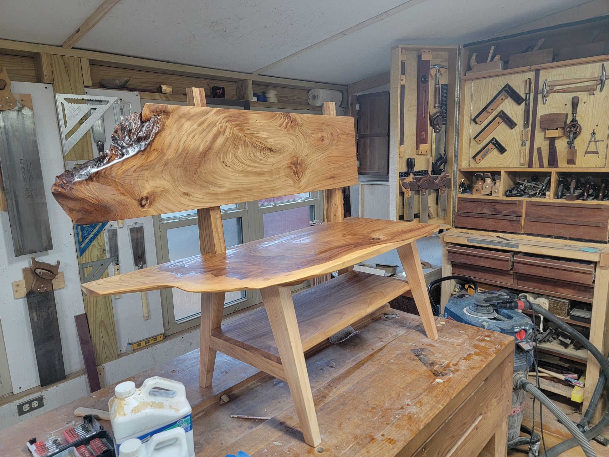 Crafted from solid Elm, this bench highlights a stunning live-edge design with natural curves and grain variations. Measures approximately 42" L × 16" W × 18" H, perfect for adding warmth and rustic character to any space.