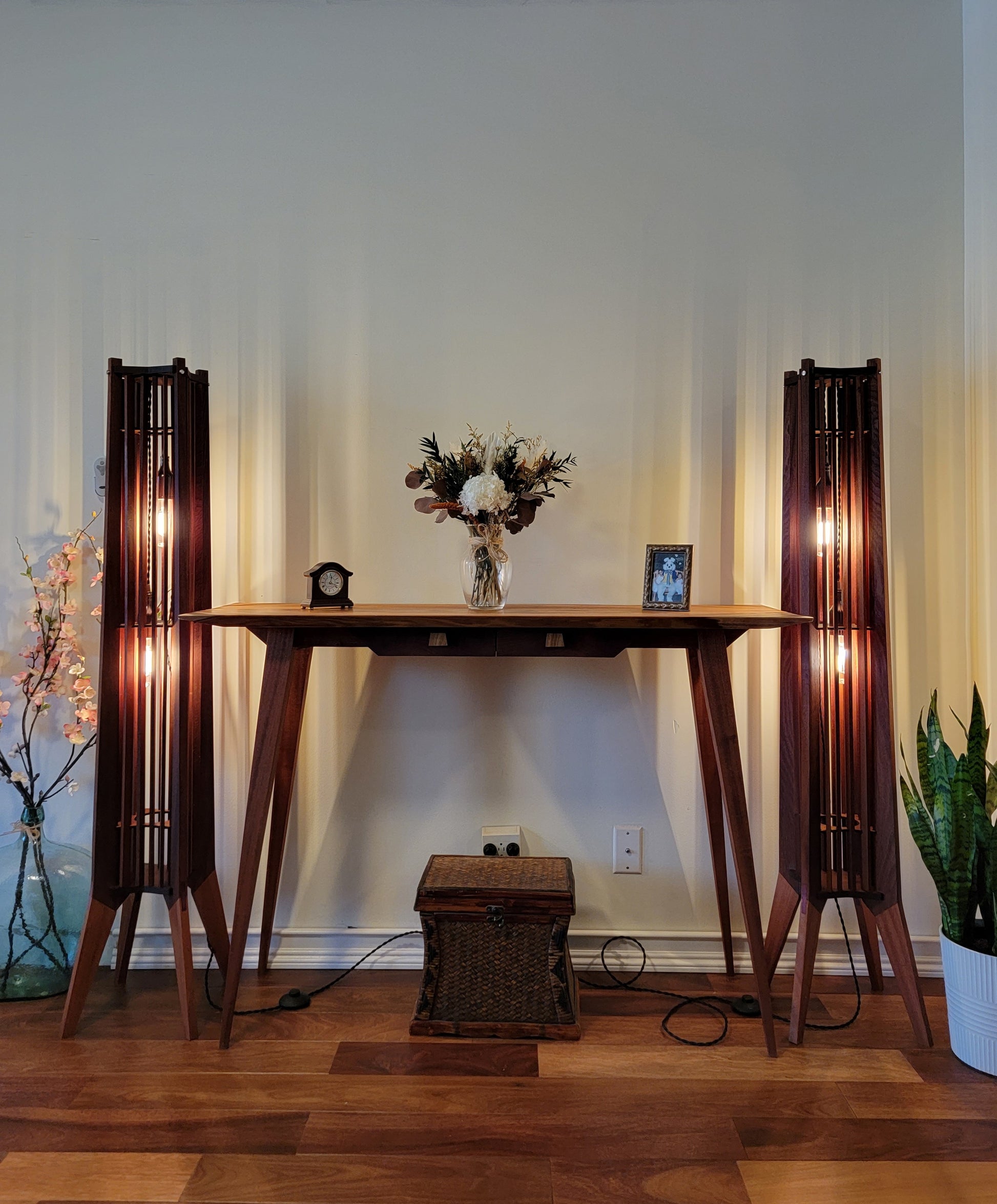 The Skyline Laura Lamp is a stunning floor lamp that combines elegance and functionality. Crafted from high-quality Sapele wood, this lamp features a sophisticated design with vertical slats that encase the light source, creating a warm and inviting glow. The lamp stands tall on four sturdy legs, ensuring stability while adding a modern touch to any room.